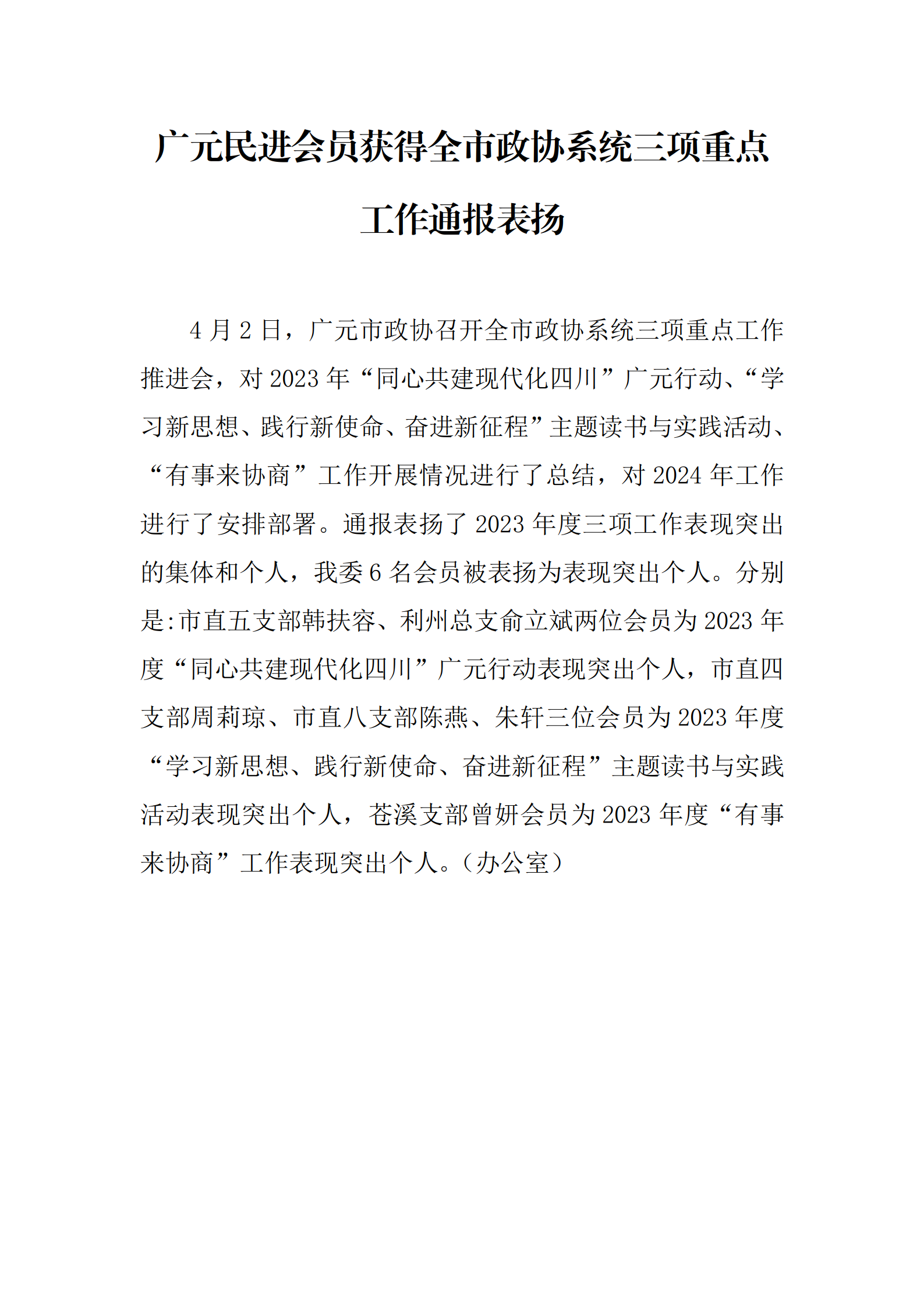 广元民进会员获得全市政协系统三项重点工作通报表扬