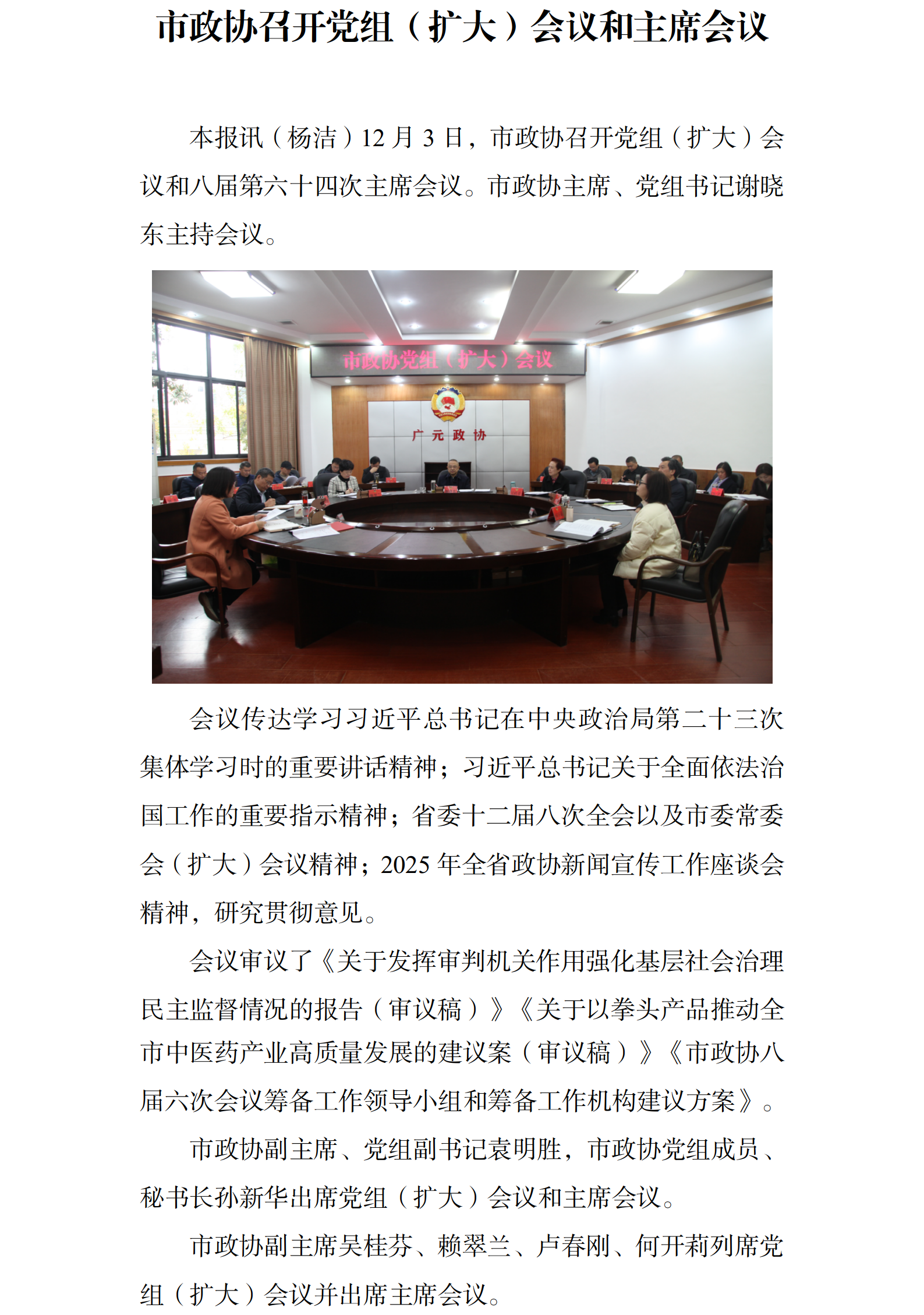 市政协召开党组(扩大)会议和主席会议