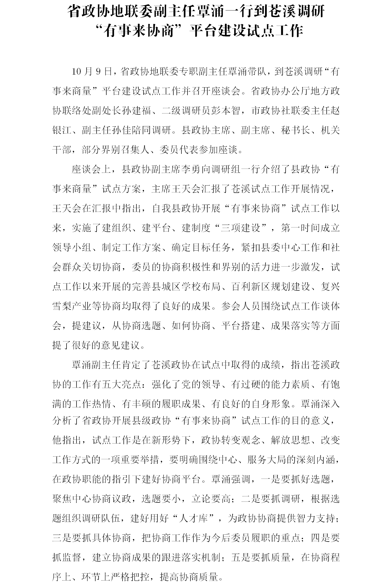 省政协地联委副主任覃涌一行到苍溪调研“有事来协商”平台建设试点工作