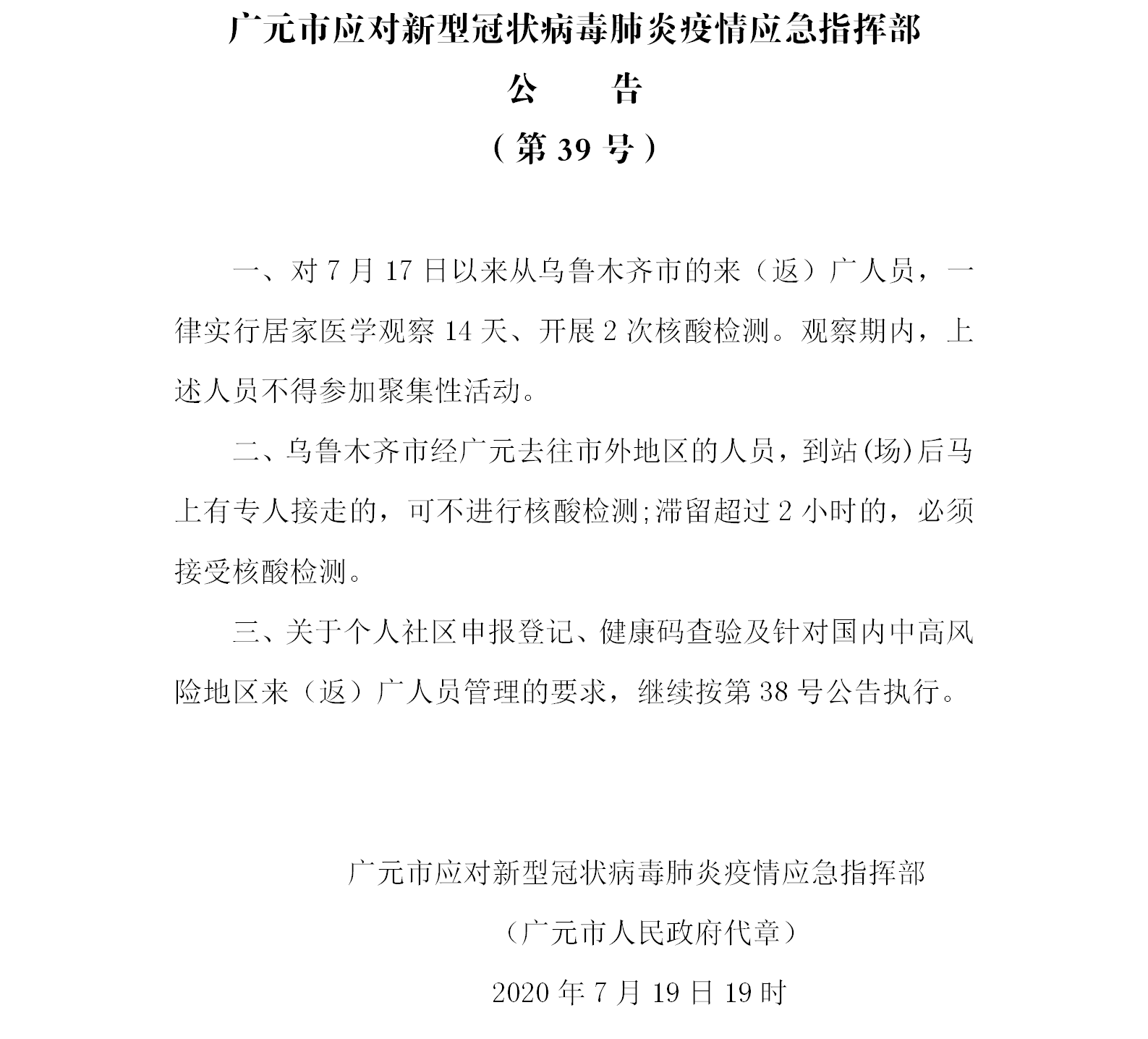 广元市应对新型冠状病毒肺炎疫情应急指挥部公告(第39号)