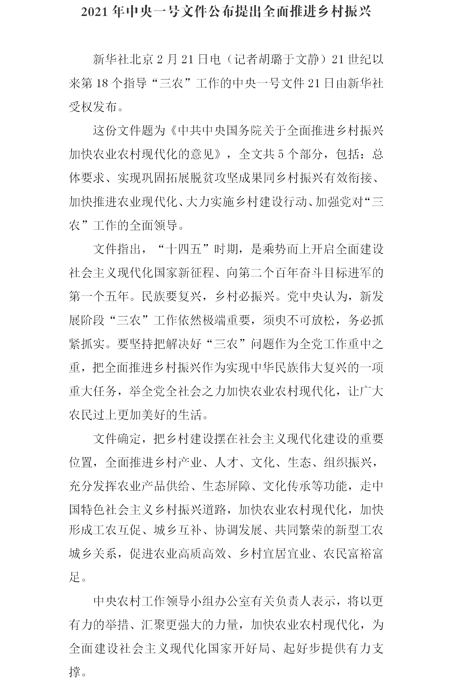 2021年中央一号文件公布提出全面推进乡村振兴